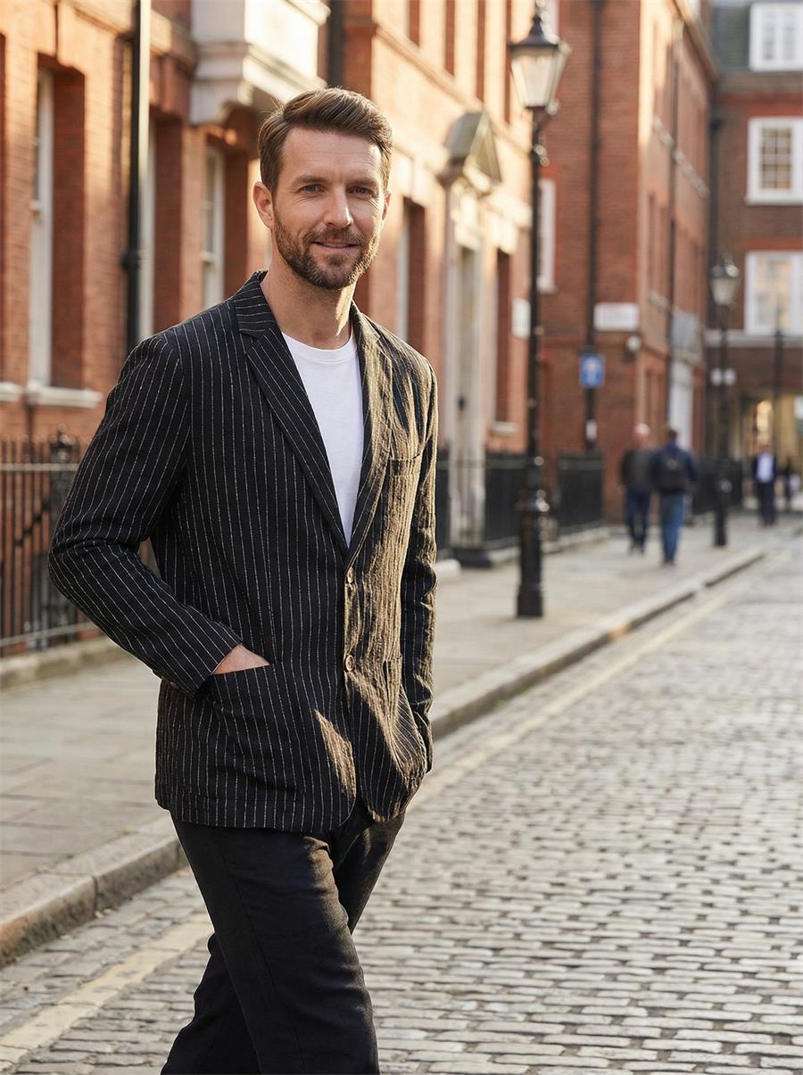 - Design: Notched lapel, two – button front, multiple patch pockets, center – back vent, loose fit, long sleeves, regular length, straight hem